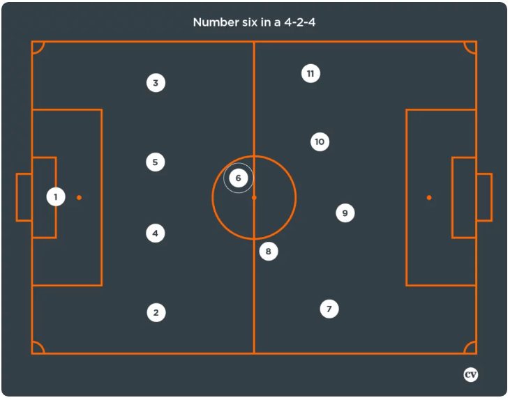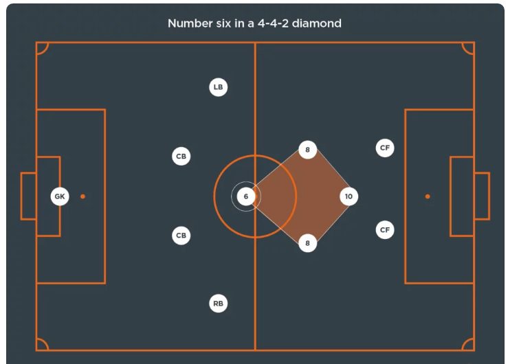 یک شماره شش تنها می تواند در یک سیتم 4-4-2 لوزی (در زیر)، یک 3-5-2، یا یک ساختار لوزی 3-4-3 عمل کند. دو شماره شش در سیستم های 3-4-3 یا 4-2-2-2 نیز وجود دارند.