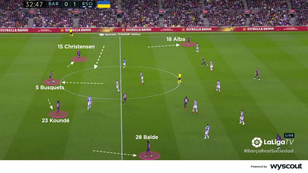 بدون توپ، شماره شش با پوشاندن دسترسی به فوروارد مرکزی حریف، پرس بالا را پشتیبانی می کند. این شماره شش همچنین باید به سمت هافبک های مرکزی حریف هجوم ببرد، زمانی که هم هافبکی های او در حمله شرکت کرده اند.