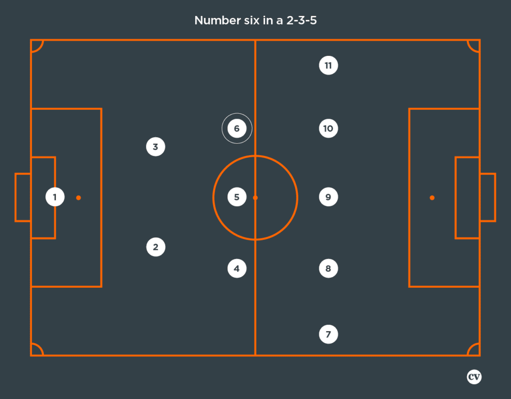 شماره شش اغلب حلقه اصلی پاس بین خط دفاعی و خط میانی است. آنها بیشتر در فضاهای جلوتر از مدافعان میانی عمل می کنند و باید گزینه های پاس کوتاه را از طریق حرکات ظریف و به موقع ارسال کنند.