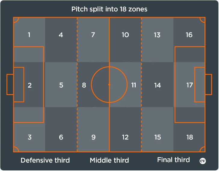 در یک بلوک تنظیمتر، شش بر روی پاسهای مرکزی تمرکز میکنند و دسترسی حریفان به فضای Zone 14 (زیر) را مسدود میکنند.