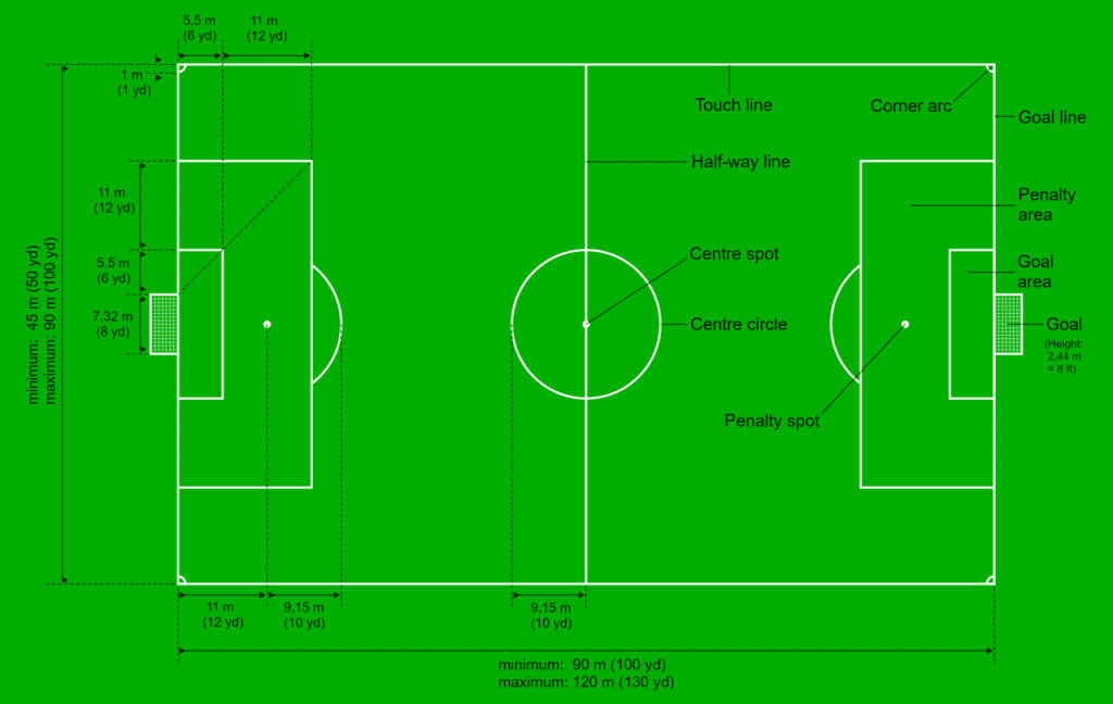 همانطور که پیش تر اشاره شد، ابعاد مختلف زمین فوتبال به دقت و طبق استانداردهای بینالمللی تنظیم میشود تا بازی به طور منظم و عادلانهای برگزار شود. در ادامه به توضیح ابعاد مختلف قسمتهای زمین فوتبال میپردازیم: